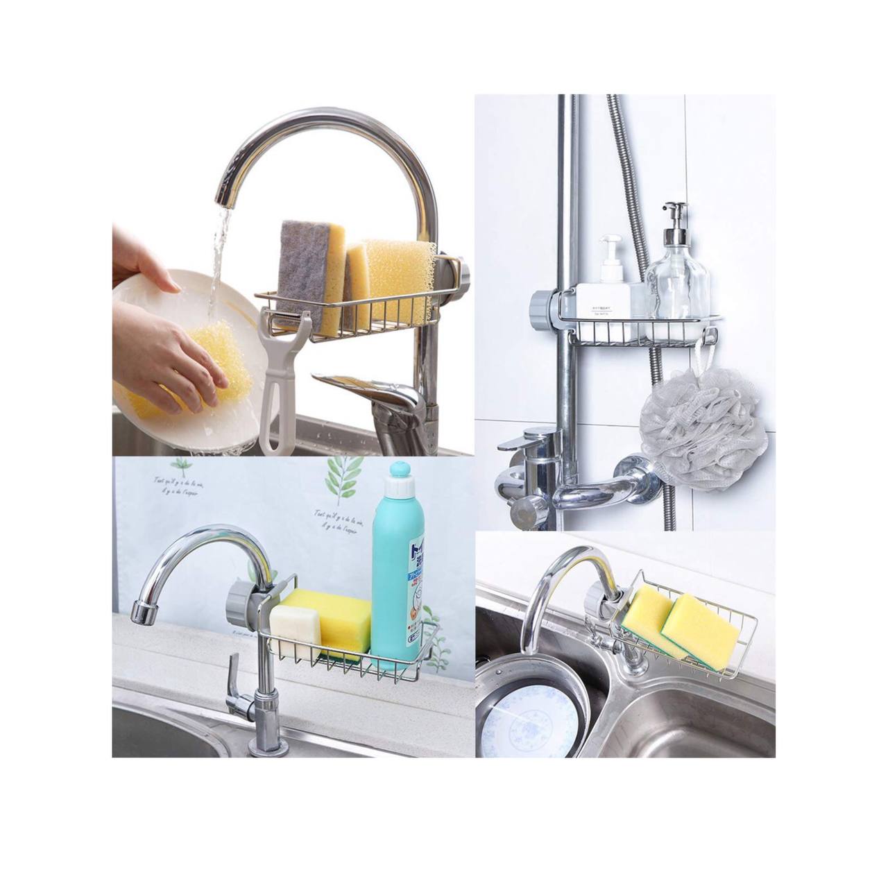 این استند مناسب برای اتصال به هر نوع شیرآلاتی می باشد. میتوانید این استند را به شیرظرفشویی، دوش حمام و... نصب کنید و از کاربرد آن بهره مند شوید. این استند برای قرار گیری اسکاچ ،سیم ظرفشویی، لیف درحمام ، شامپو،مایع ظرفشویی، پارجه، حوله و... مناسب می باشد. بدون هیچ گونه سختی و سوراخ کردن دیوار میتوانید این وسیله را به راحتی به شیرآلات متصل کنید و با پیچی که کنار این جا اسکاچی تعبیه شده است آن را محکم کنید.